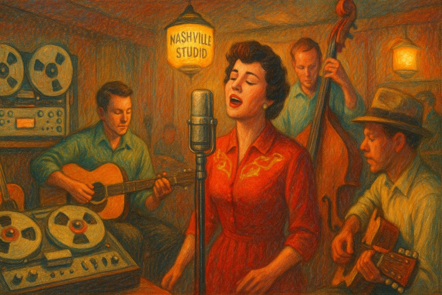 One of the defining voices of this new era was Patsy Cline, whose rich, emotive vocal style brought elegance and depth to country ballads. Her recordings—especially “Walkin’ After Midnight” and “Crazy”—combined heartbreaking emotional delivery with lush orchestral arrangements that became hallmarks of the Nashville Sound. Cline’s artistry bridged traditional country storytelling with mainstream pop sensibilities, proving that country music could be both deeply expressive and commercially successful.