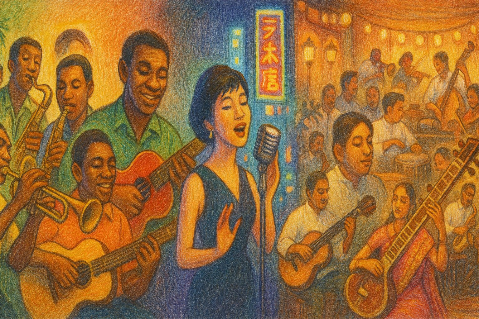 Across Asia, urbanization and modern media helped create new pop traditions that blended Western forms with local aesthetics. In Japan, the genre of kayōkyoku flourished, drawing melodic inspiration from enka and Western pop while building a foundation for the city-pop and J-pop movements of later decades. Artists such as Hibari Misora became cultural icons, their expressive vocals capturing the emotional depth of post-war Japan. Jazz clubs also thrived in cities like Tokyo and Osaka, where local musicians performed alongside American servicemen and visiting jazz artists.