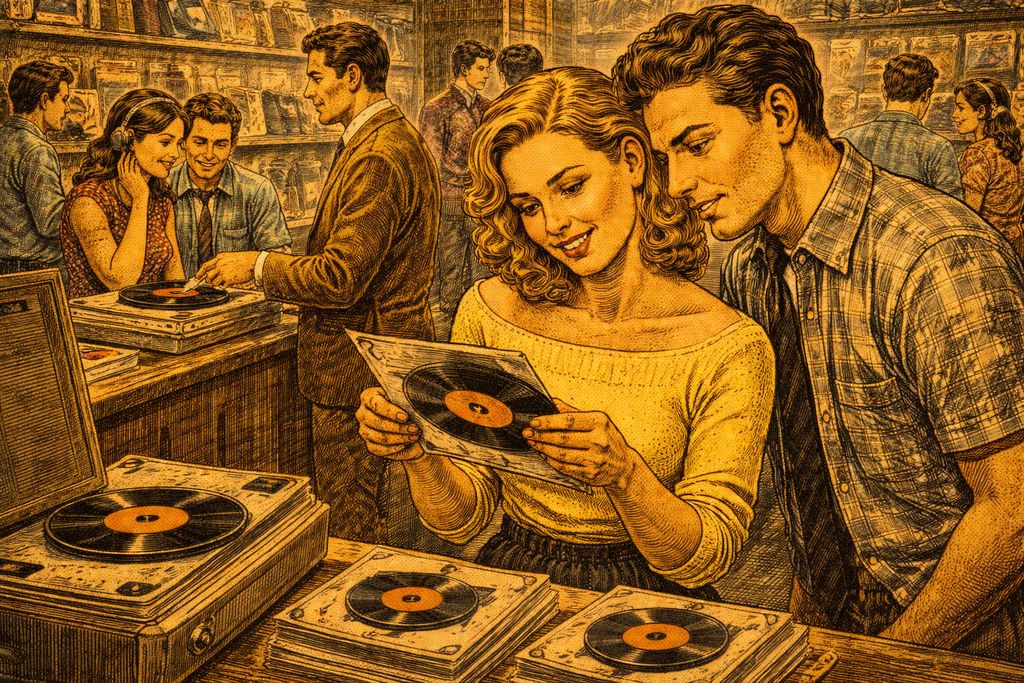 The shift from shellac to vinyl changes listening habits in subtle but lasting ways. Records become cheaper, more durable, and easier to distribute. The rise of the 45 rpm single favors short, immediate songs that can grab attention quickly. At the same time, the long-playing album begins to offer space for mood and cohesion, even if it is not yet the primary format for popular hits.