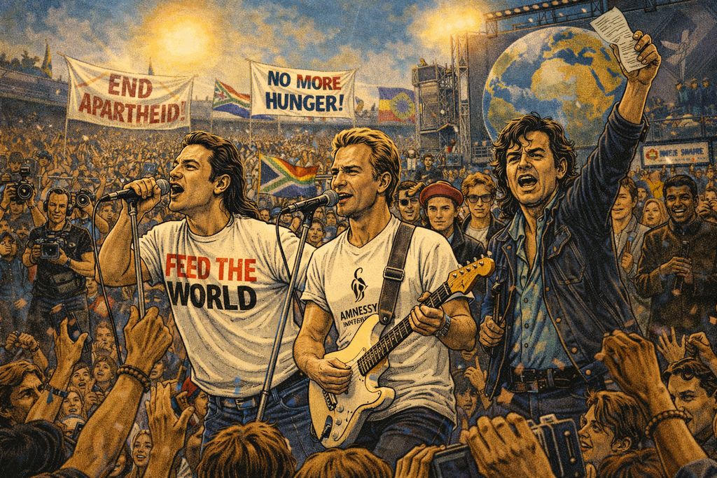 Alongside commercial mega tours, the 1980s saw the rise of large-scale charity concerts that framed live music as a vehicle for moral action and global awareness. These events operated within the same technological and logistical systems as stadium tours, but they carried a different promise. Music was presented not only as entertainment, but as a means of response to crisis. In doing so, charity concerts reshaped expectations about what popular music could represent in public life.