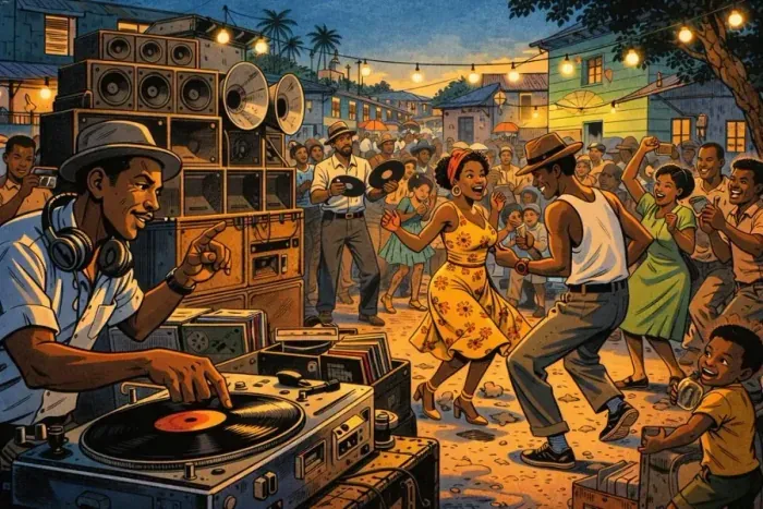 Many of the records young Jamaicans heard came from the United States. Rhythm and blues, jump blues, and early soul drifted across the Caribbean through radio signals and imported singles. Local entrepreneurs began building powerful mobile sound systems so they could play those records at outdoor parties. These gatherings were loud, competitive, and deeply social. A successful dance could draw hundreds of people into a single yard or street corner.